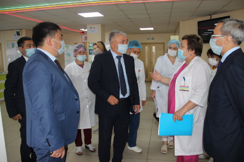 Денсаулық сақтау мекемесіне арнайы ат басын бұрған Қуанышбек Қалиұлы мекемені аралап, материалдық-техникалық базасымен танысты. Аурухана директорының стратегиялық даму жөніндегі орынбасары Гүлмира Отынбекованың сөзінше, аурухана бір ауысымда 1825 адам қабылдауға қауқарлы. 158 орындық күндізгі стационар жұмыс істейді. Ауруханға тіркелген 213 223 тұрғынға медициналық қызметтің барлық түрін көрсетеді. Тіркелгендердің 71 439-ы – балалар. Олардың денсаулығын қадағалау жіті жүргізілуде және 50 орындық балалар бөлімі жұмыс істейді. Сонымен қатар дәрігерлер ана мен бала денсаулығына баса мән береді.