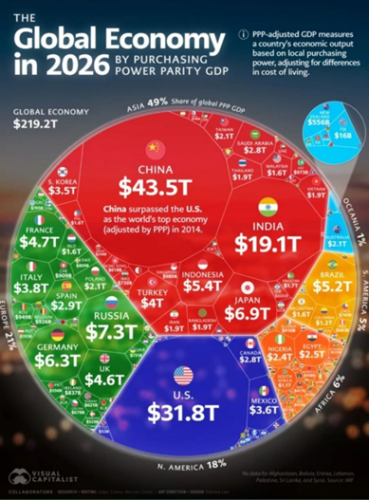Общий объём мировой экономики по этому показателю достиг 219,2 трлн долларов, при этом почти половина глобального ВВП приходится на страны Азии.