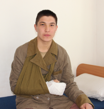 Әскерге Шымкент қаласынан келдім. Жасым 20-да. Алған жарақатым – аяғымның сіңірі созылған, жабық бас ми жарақаты. Қазір жағдайым жақсы.